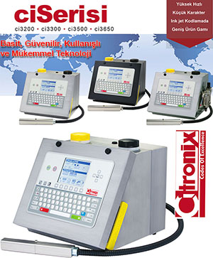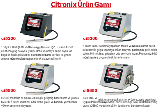 şekilde kodlama imkanları sunmaktadır. Citronix Ci Serisi endüstriyel ink-jet kodlama teknolojisi ile küçük karakter tarih kodlama, barkod, logo, grafik, metrajlama, ürün sayımı, parti, seri numarası, karekod vs. gibi farklı endüstriyel üretim alanlarına has bilgileri üretim esnasında, en yüksek üretim hat hızlarında bile kesintisiz, temassız ve varolan ink-jet